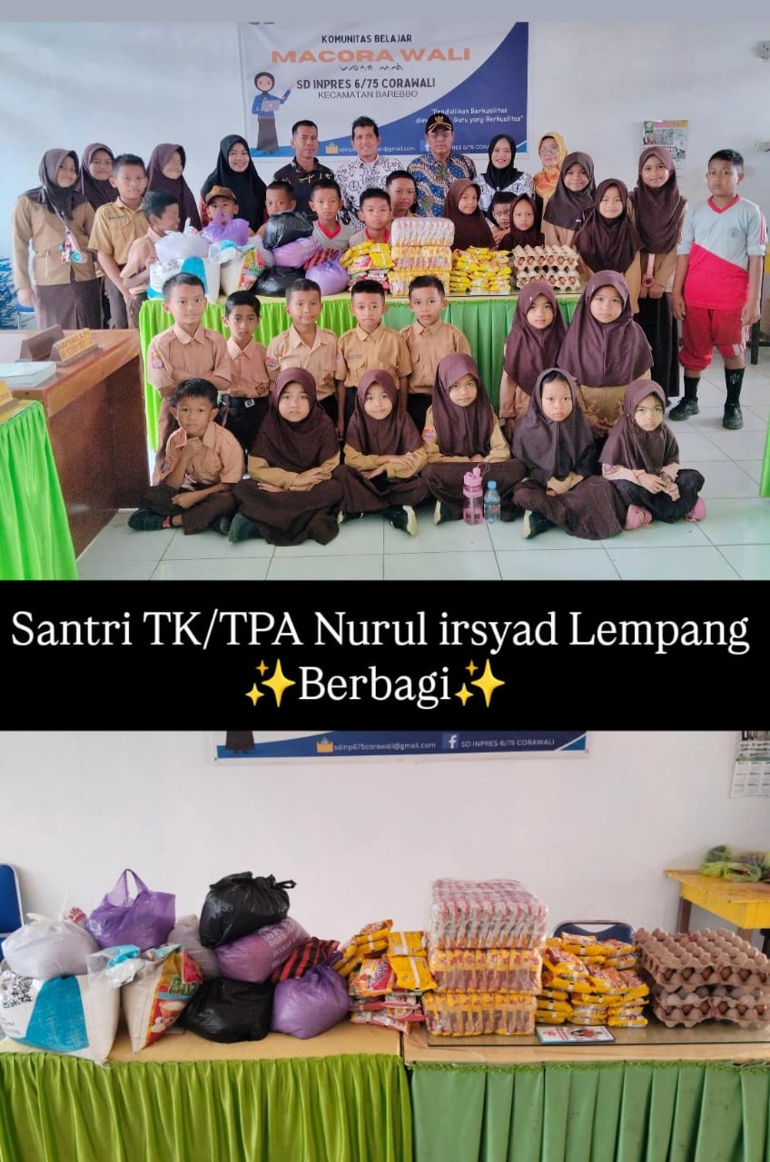 BONE,PO – Orang tua santri TK TPA Nurul Irsyad Lempang menyerahkan bantuan sembako kepada UPT SD Inpres 6/75 Corawali, Kecamatan Barebbo, pada Sabtu 9 Agustus 2025.