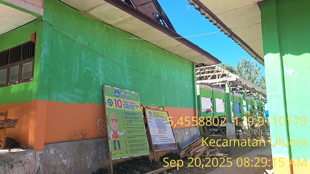 Pantauan publikasionline.id, Sabtu 20 September 2025 sekitar pukul 08.30 Wita, papan informasi proyek tidak terlihat dari jalan poros maupun depan sekolah. Justru, papan proyek ditemukan dalam kondisi bersandar di area belakang gedung yang tengah dikerjakan, jauh dari jangkauan publik.
