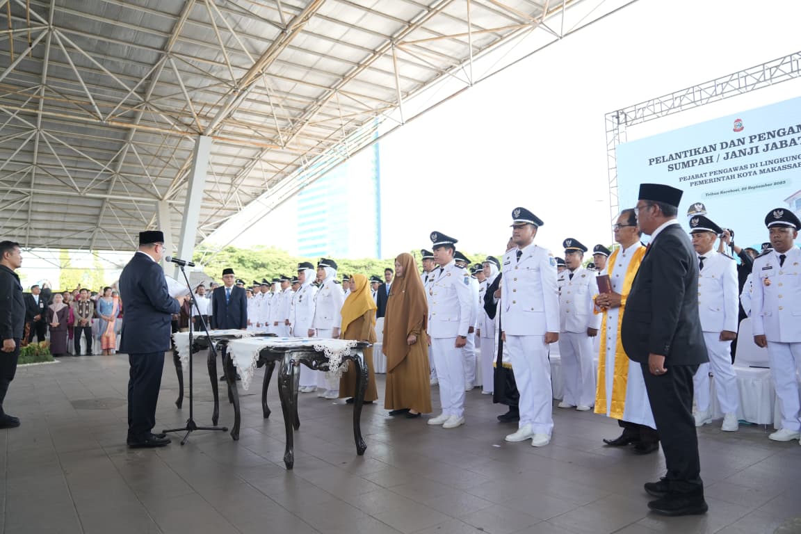 Prosesi pelantikan dan pengambilan sumpah/janji jabatan berlangsung di Tribun Lapangan Karebosi, Senin (29/09/2025), disaksikan jajaran forkopimda dan pejabat lingkup Pemkot Makassar.
