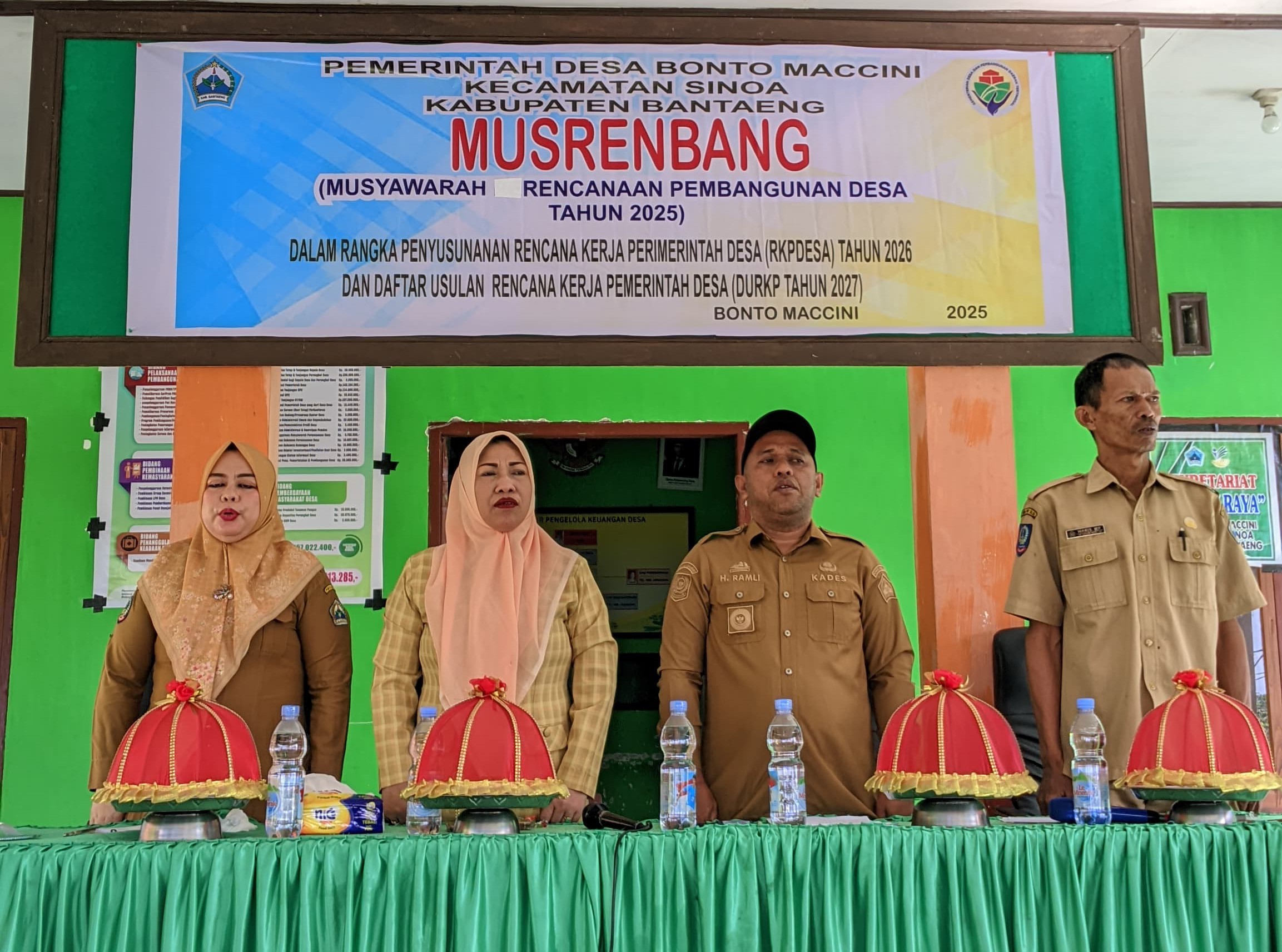 BANTAENG,PO – Pemerintah Desa Bonto Maccini, Kecamatan Sinoa, Kabupaten Bantaeng, menggelar Musyawarah Rencana Pembangunan Desa (Musrenbang) Tahun 2025 pada Selasa, 7 Oktober 2025, bertempat di Aula Kantor Desa Bonto Maccini.