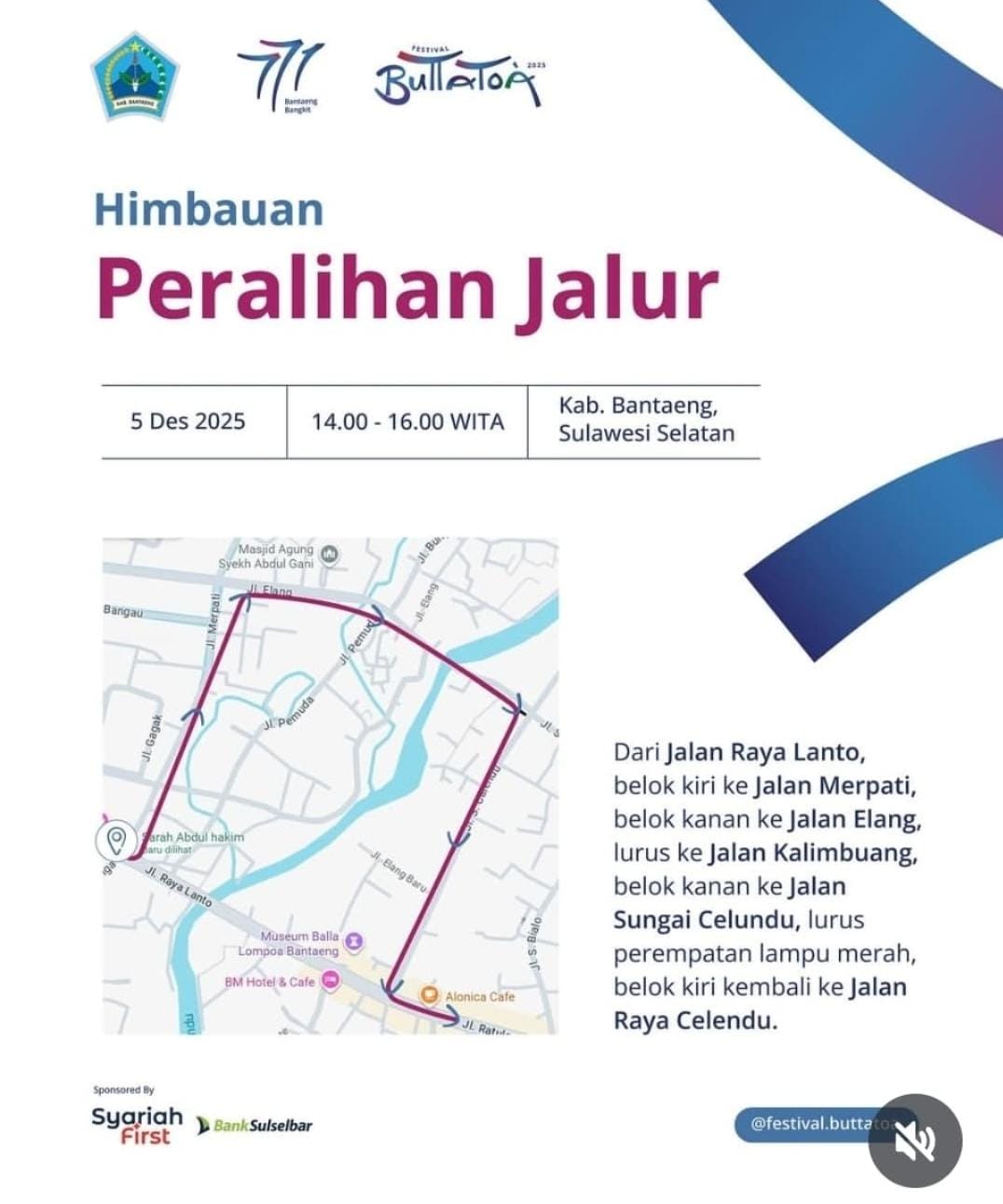 > “Rekayasa jalur ini penting untuk menjaga keamanan dan kenyamanan publik selama puncak peringatan Hari Jadi Bantaeng ke-771. Kami berharap pengguna jalan dapat bekerja sama demi kelancaran bersama,” ujar panitia penyelenggara Festival Butta Toa 2025.
