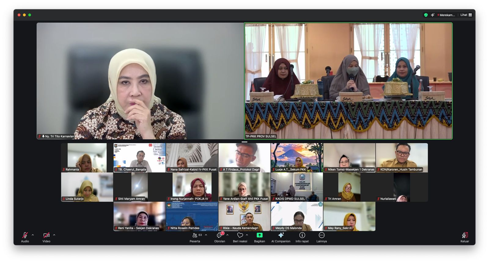 Rapat perdana persiapan tersebut dilaksanakan melalui aplikasi Zoom Meeting dan diikuti oleh jajaran pengurus TP PKK Pusat, pengurus TP PKK Provinsi Sulawesi Selatan, unsur pemerintah daerah terkait, serta pihak-pihak yang terlibat langsung dalam rencana penyelenggaraan kegiatan nasional tersebut.