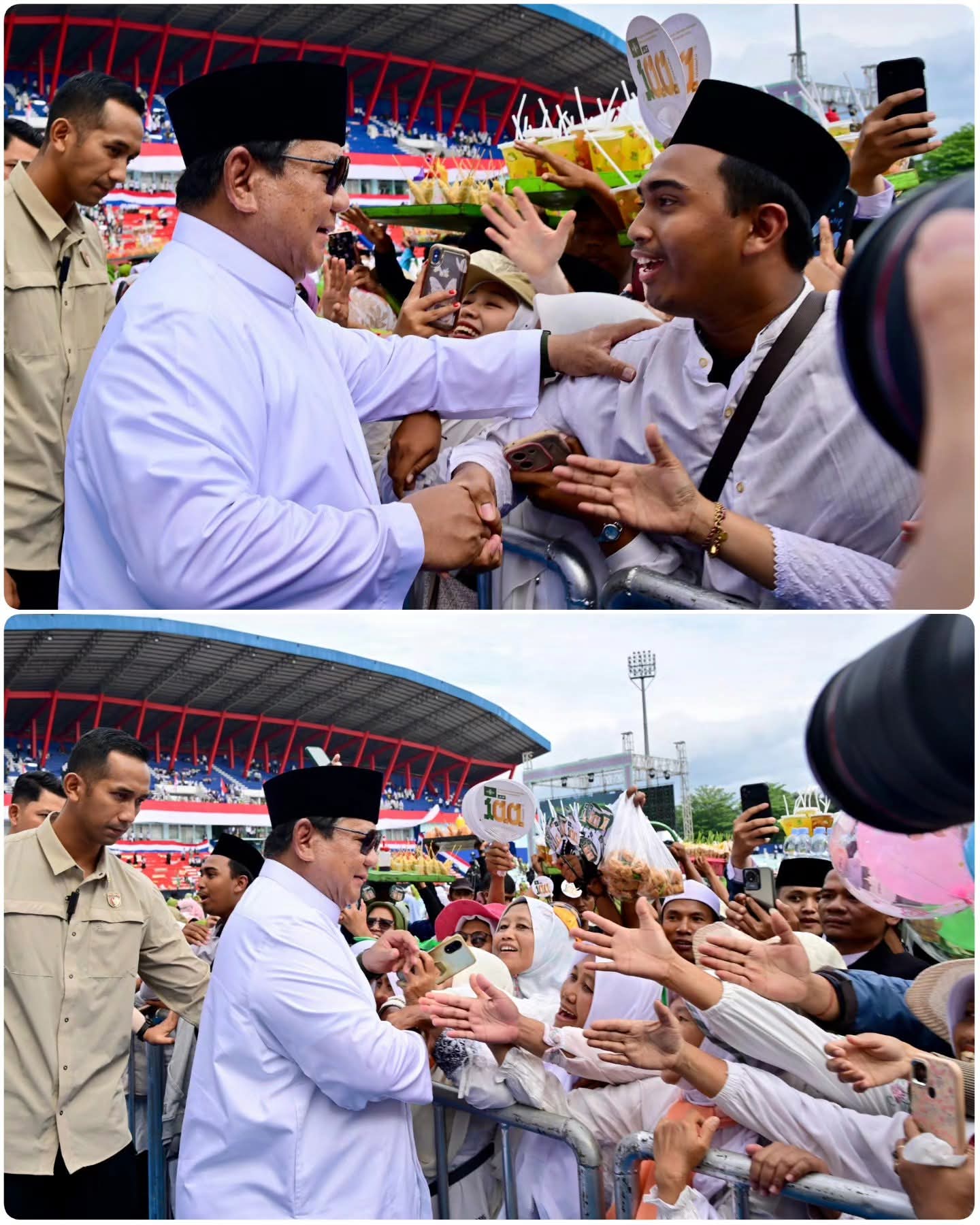 Presiden Prabowo Subianto disambut ratusan ribu jemaah NU yang telah memadati stadion sejak malam hari.