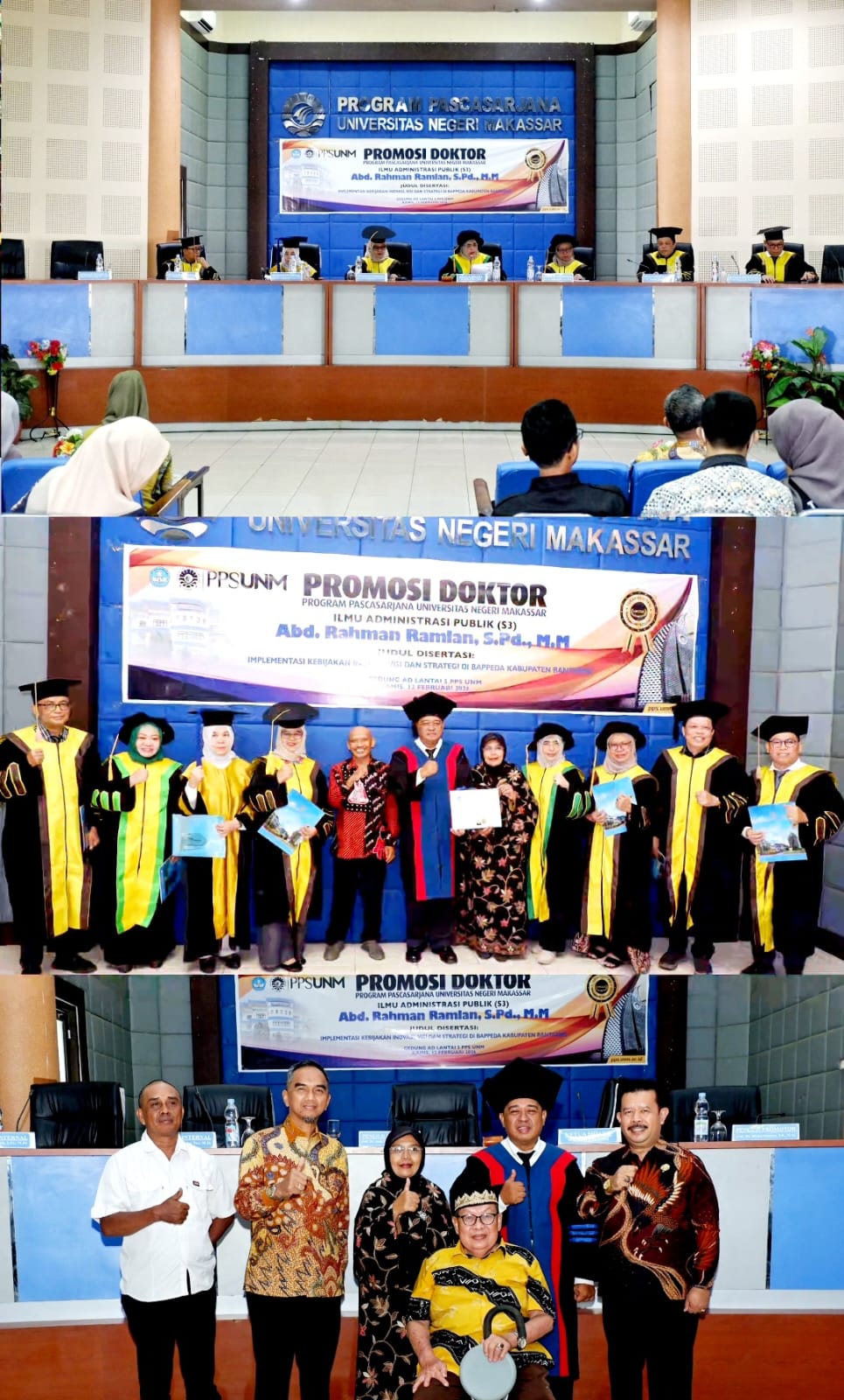 Sidang promosi doktor itu sekaligus menandai puncak perjalanan akademik Rahman Ramlan setelah ia berhasil mempertahankan disertasi berjudul “Implementasi Kebijakan Inovasi, Visi dan Strategi di Bappeda Kabupaten Bantaeng.” Ia resmi menyandang gelar doktor bidang Administrasi Publik dengan predikat Cum Laude.