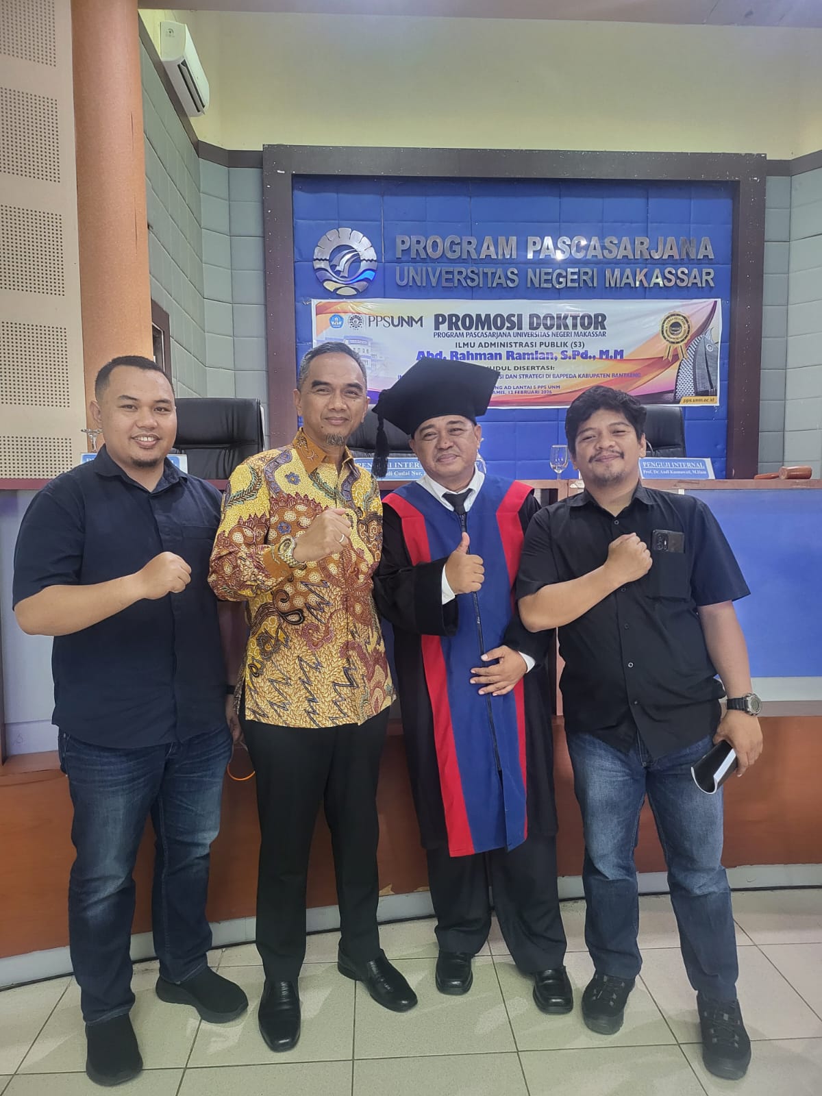 MAKASSAR,PO — Sekretaris Dinas Kesehatan Kabupaten Bantaeng, H. Iwan Setiawan, menyampaikan ucapan selamat kepada Dr. Abdul Rahman Ramlan atas keberhasilannya meraih gelar doktor di bidang Administrasi Publik. Promosi doktor tersebut berlangsung di Gedung AD Lantai 5 Program Pascasarjana Universitas Negeri Makassar (UNM), Kamis (12/2/2026).