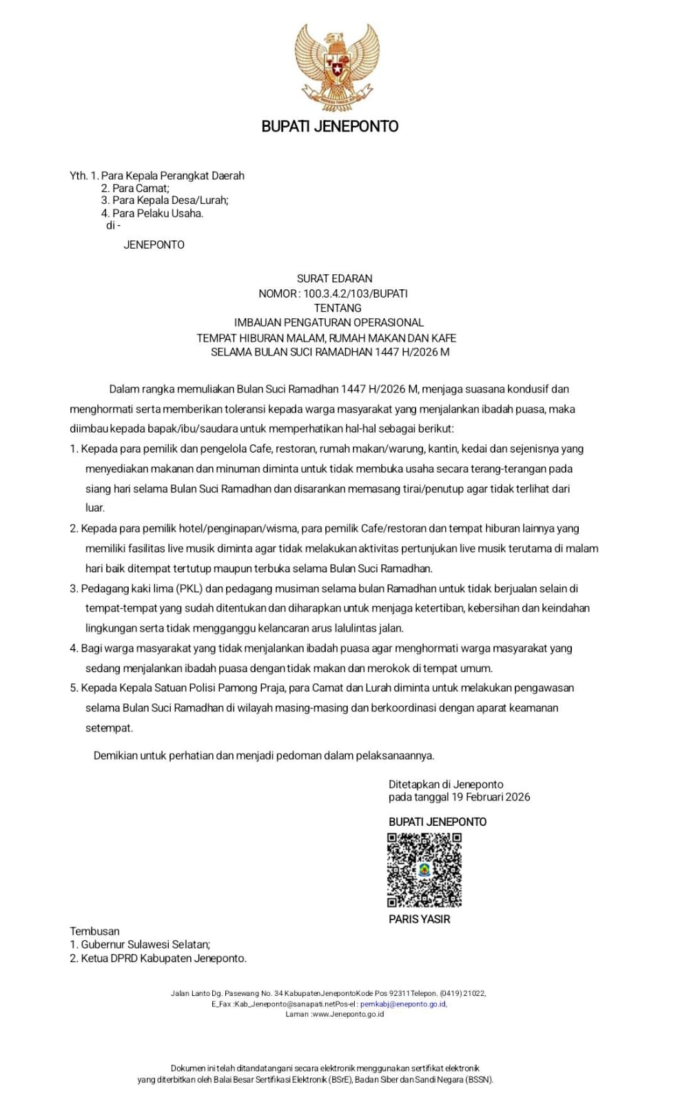 Jeneponto,PO – Bupati Jeneponto, H. Paris Yasir, S.E., M.M., resmi menerbitkan Surat Edaran Nomor 100.3.4.2/103/BUPATI tentang Imbauan Pengaturan Operasional Tempat Hiburan Malam, Rumah Makan, dan Kafe selama Bulan Suci Ramadhan 1447 H/2026 M.