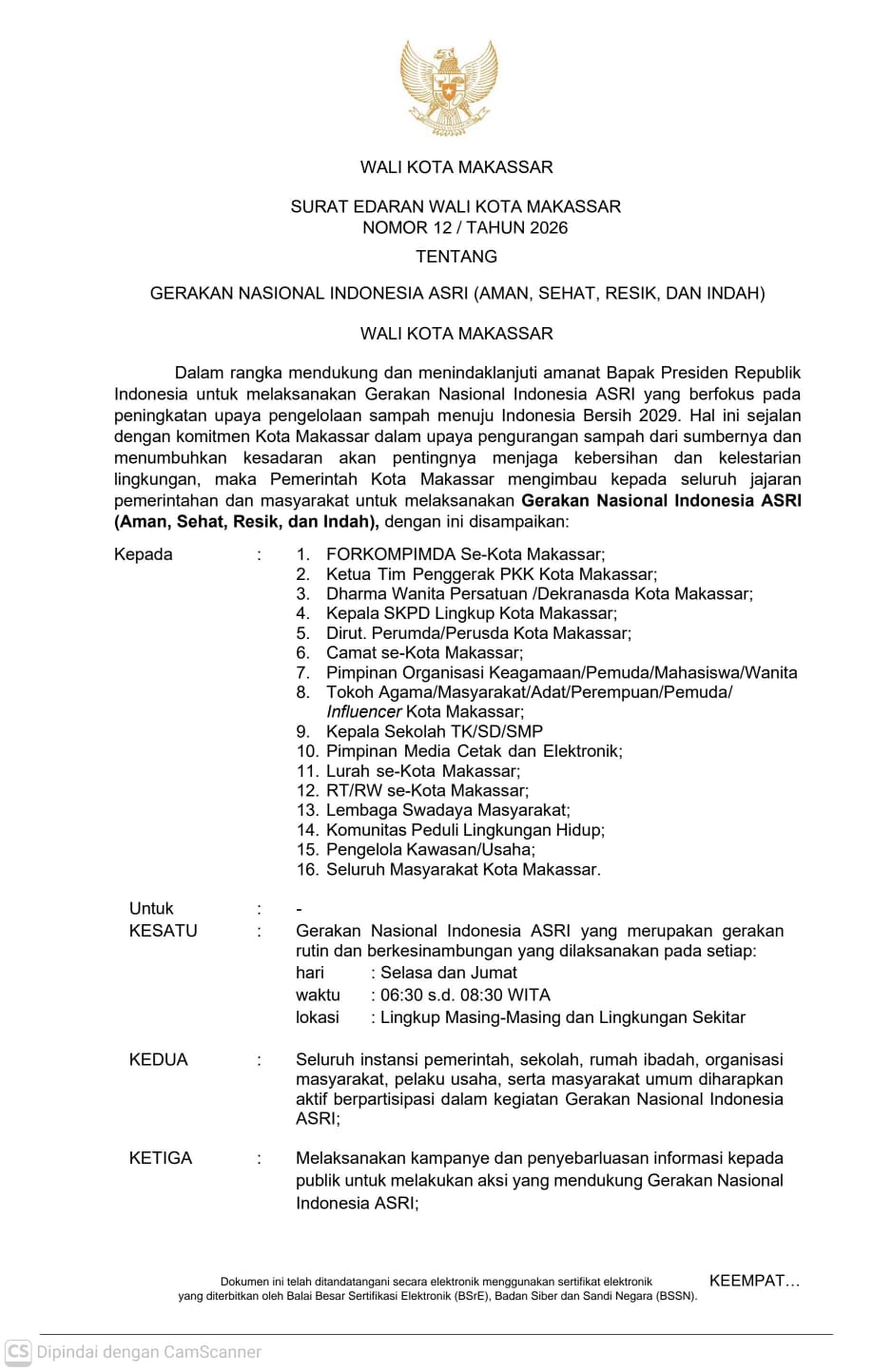 MAKASSAR,PO — Wali Kota Makassar, Munafri Arifuddin, resmi menerbitkan Surat Edaran (SE) Nomor 12 Tahun 2026 tentang Gerakan Nasional Indonesia ASRI (Aman, Sehat, Resik, dan Indah).