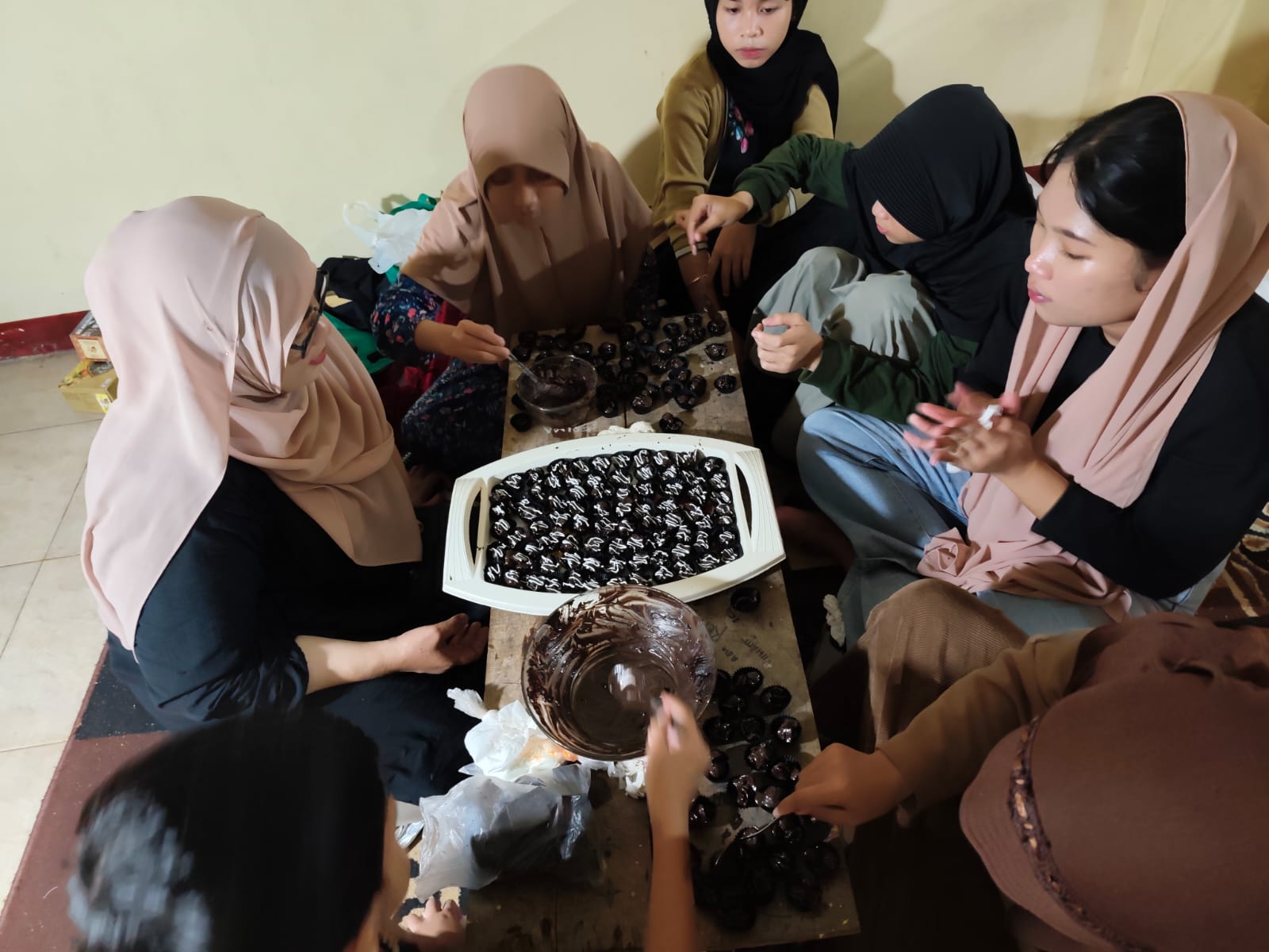 Suasana belajar berlangsung dengan penuh antusias. Meski hujan turun deras di luar lorong, anak-anak terlihat bersemangat mengikuti setiap tahapan pembuatan coklat yang dipandu langsung oleh Ibu Osy. Tangan-tangan kecil mereka sibuk mencampur bahan, mencetak coklat, hingga menata hasilnya dengan penuh rasa bangga.