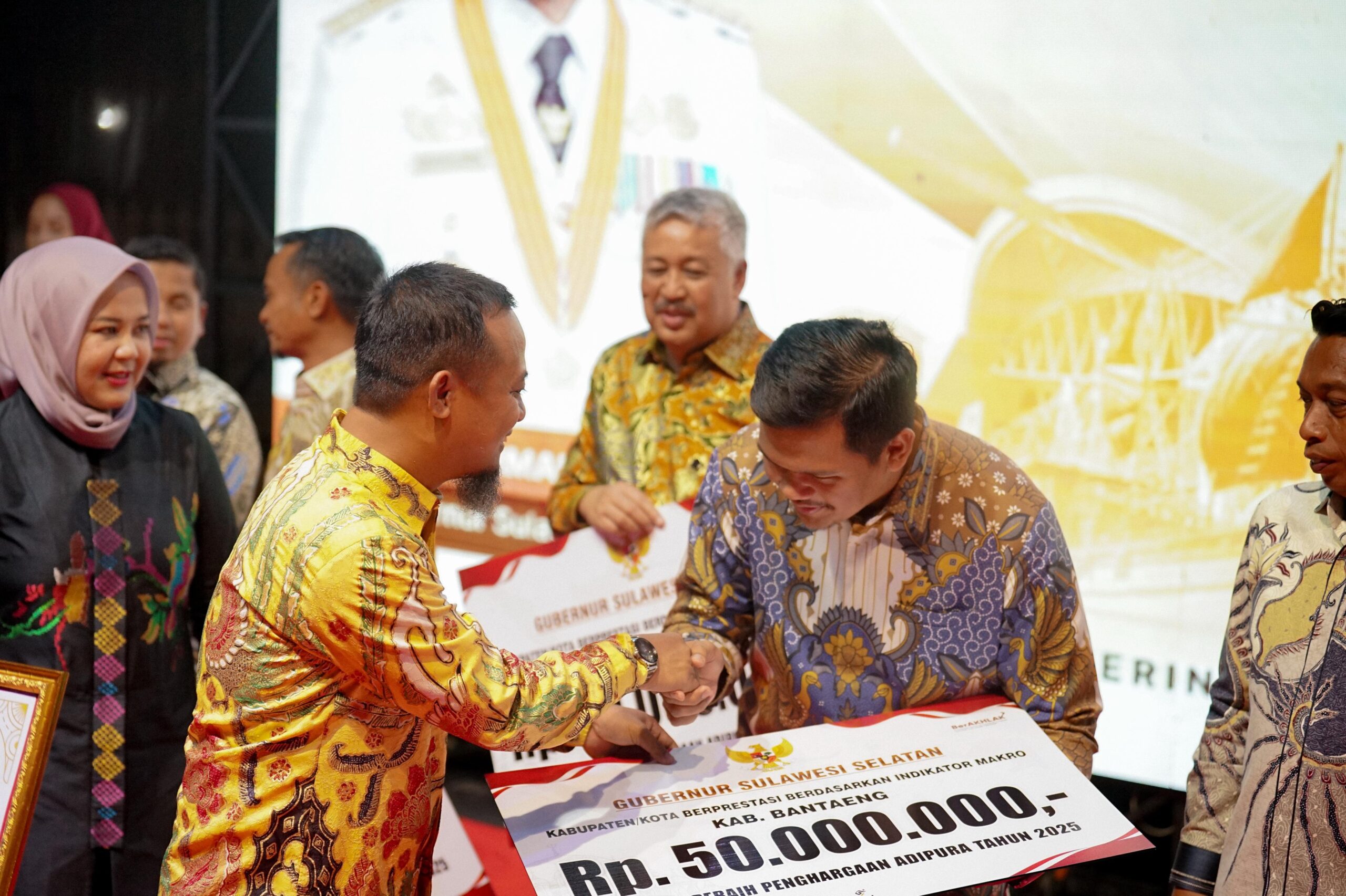 BANTAENG,PO – Bupati Bantaeng, M. Fathul Fauzy Nurdin menerima secara langsung apresiasi sebagai salah satu Kabupaten Berprestasi berdasarkan Indikator Makro sebesar Rp.50 juta pada kategori peraih Penghargaan Adipura Tahun 2025. Penyerahan diserahkan oleh Gubernur Sulawesi Selatan, H. Andi Sudirman Sulaiman di Rumah Jabatan Gubernur Sulawesi Selatan, Minggu 29 Maret 2026.