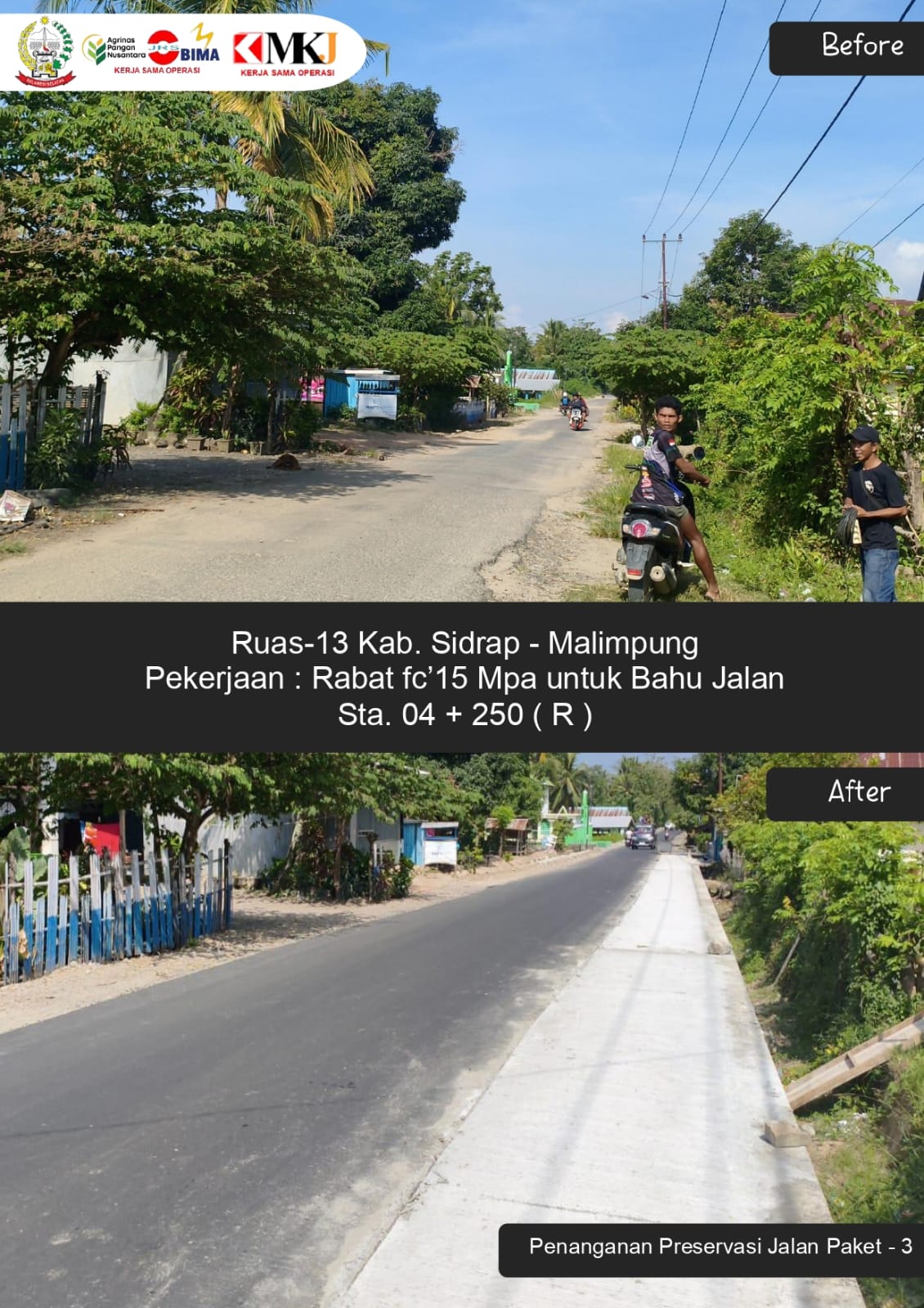Adapun pada Ruas 13 Batas Kabupaten Sidrap–Malimpung, penanganan meliputi pemasangan batu dengan mortar, pemasangan batu talud, serta rabat beton bahu jalan dengan mutu fc’15 MPa guna meningkatkan keselamatan pengguna jalan.
