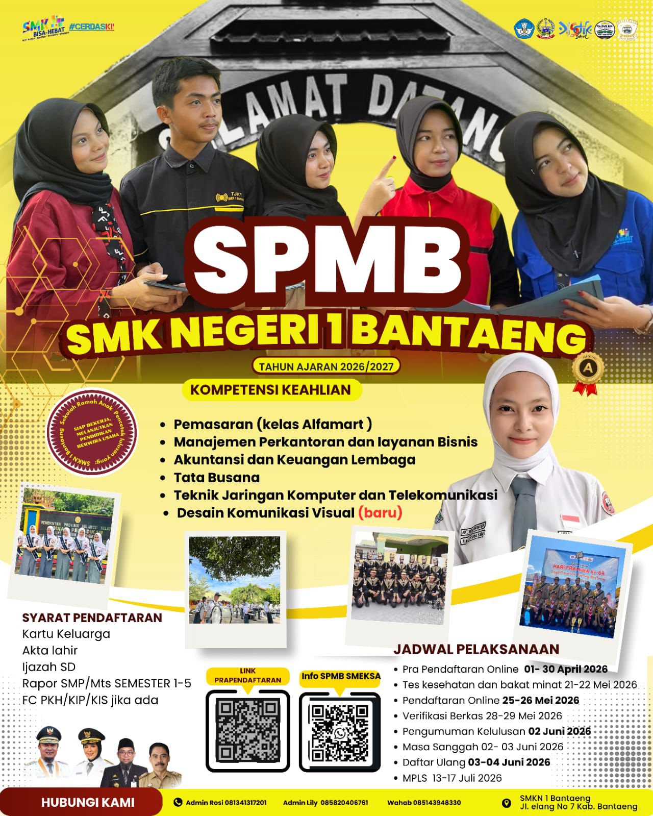 BANTAENG,PO – Sekolah Menengah Kejuruan Negeri (SMKN) 1 Bantaeng kembali membuka Seleksi Penerimaan Murid Baru (SPMB) Tahun Ajaran 2026/2027 dengan menghadirkan sejumlah jurusan unggulan, termasuk satu jurusan baru yakni Desain Komunikasi Visual (DKV).